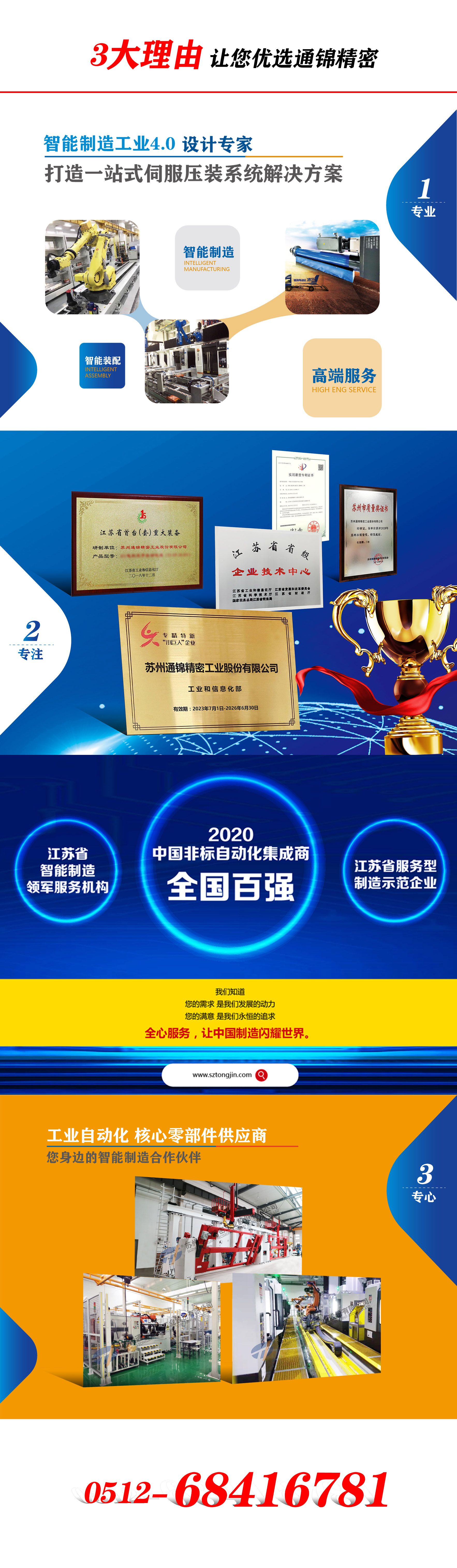 多年來公司一直以“工廠實現綠色無人化”為愿景;以“通向世界、錦繡中華”為使命;以“創(chuàng)新、進取、誠信、和諧”為企業(yè)核心價值觀。公司在引進國外高尖端自動化核心元件的基礎上,大力投入研發(fā)資金,主要針對新能源汽車,光伏、5G、儲能電池等行業(yè)智能伺服裝配技術需求,已成功自主研發(fā)、設計、組裝、銷售通錦牌伺服電動缸、智能伺服壓裝機、第七軸機器人、(重型)桁架機器人等自主產品,結合六關節(jié)機器人實現自動化、安全化、無人化的智能裝配綠色無人化生產線,提供一站式工廠智能裝配自動化系統(tǒng)整體解決方案,實現工業(yè)4.0。同時為客戶提供高端貿易品牌工控核心零部件:意大利Gambini齒輪齒條、Panasonic伺服系統(tǒng)、Rexroth變頻器、Nidec減速機、APEX減速機。